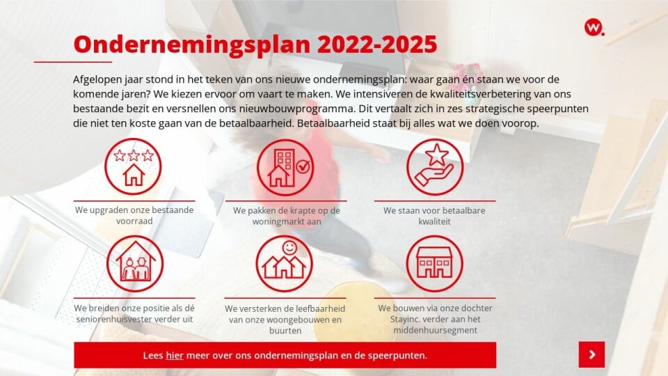 Afgelopen jaar stond in het teken van ons nieuwe ondernemingsplan: waar gaan én staan we voor de komende jaren? We kiezen ervoor om vaart te maken. We intensiveren de kwaliteitsverbetering van ons bestaande bezit en versnellen ons nieuwbouwprogramma. Dit vertaalt zich in zes strategische speerpunten die niet ten koste gaan van de betaalbaarheid. Betaalbaarheid staat bij alles wat we doen voorop.