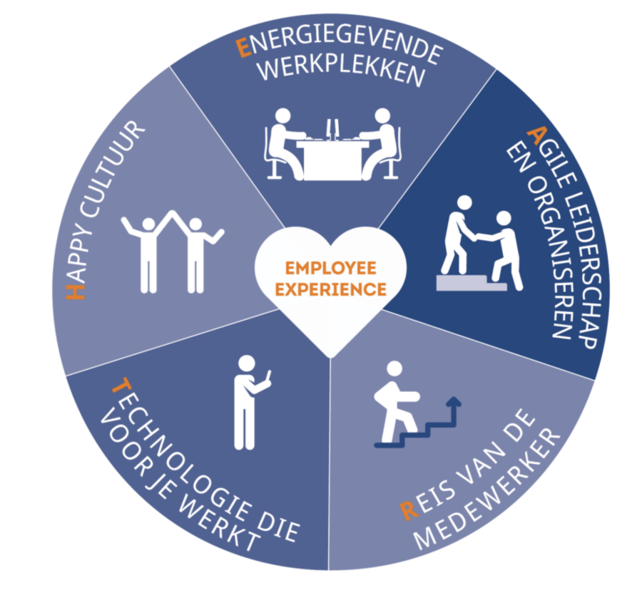 De A staat voor Agile leiderschap en organiseren. Zijn leidinggevenden in staat snel en flexibel te reageren op ontwikkelingen? Weet de leidinggevende wat er omgaat in medewerkers? Kunnen medewerkers zichzelf zijn? Geven we complimenten en vieren we successen? Krijgen medewerkers coaching als ze willen groeien en ondersteuning nodig hebben?